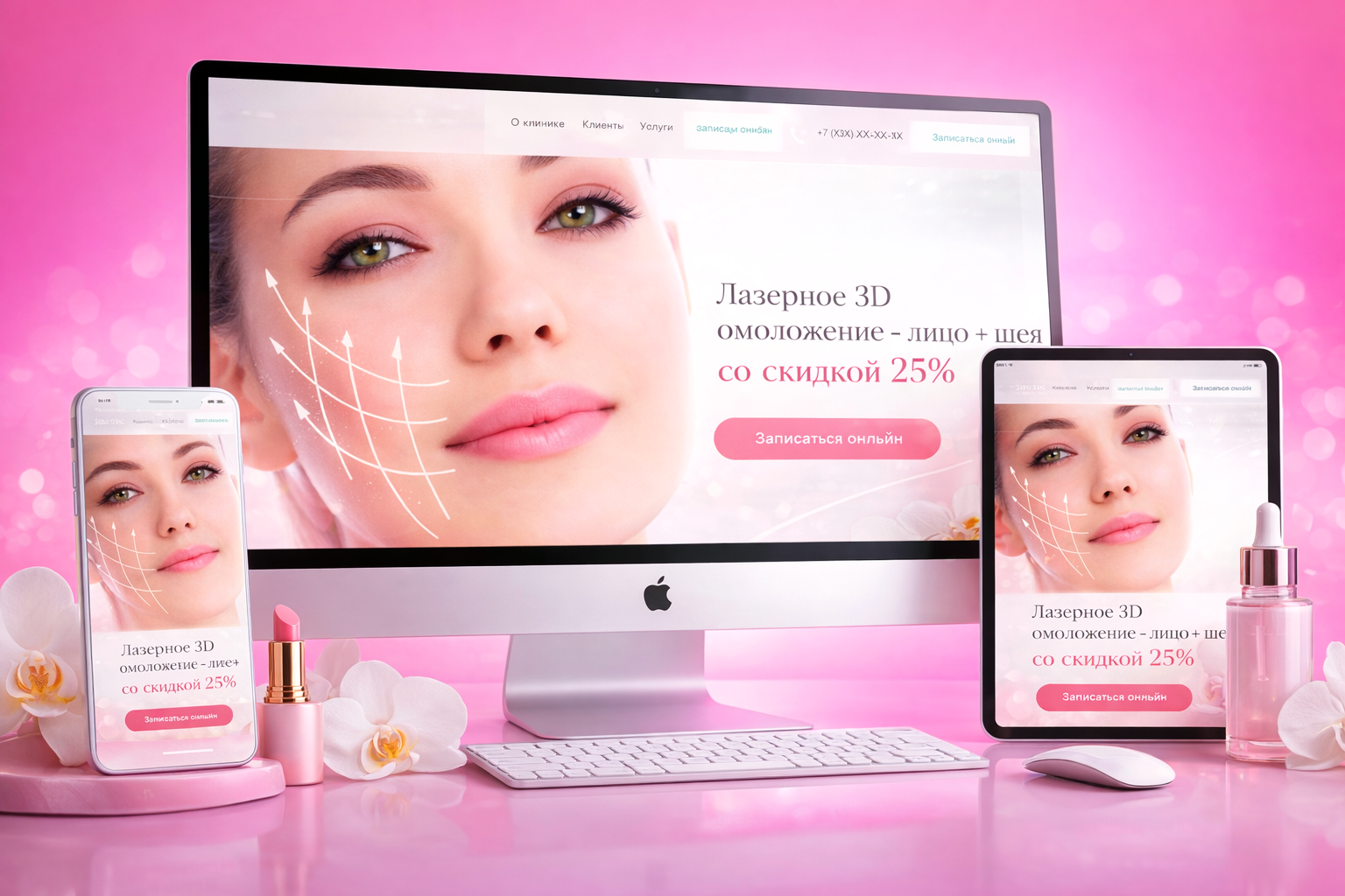 Стартовый экран сайта Врачебнаякосметика.рф устроен как контролируемая точка входа: он одновременно удерживает внимание и направляет пользователя дальше по сценарию. По такому принципу собираются продуманные медицинские сайты, где интерфейс выполняет роль оператора внимания, а не декоративной оболочки. Пространственная композиция первого экрана, мягкие цветовые решения и плавные переходы между элементами снижают зрительное напряжение и увеличивают время удержания пользователя на первом экране на 30–35%. Это время критично: за него посетитель успевает вовлечься, перейти к перечню услуг и дойти до формы записи, что напрямую отражается на росте конверсии и выручки при том же объеме входящего трафика. Веб-дизайн создан РОСТСАЙТ.