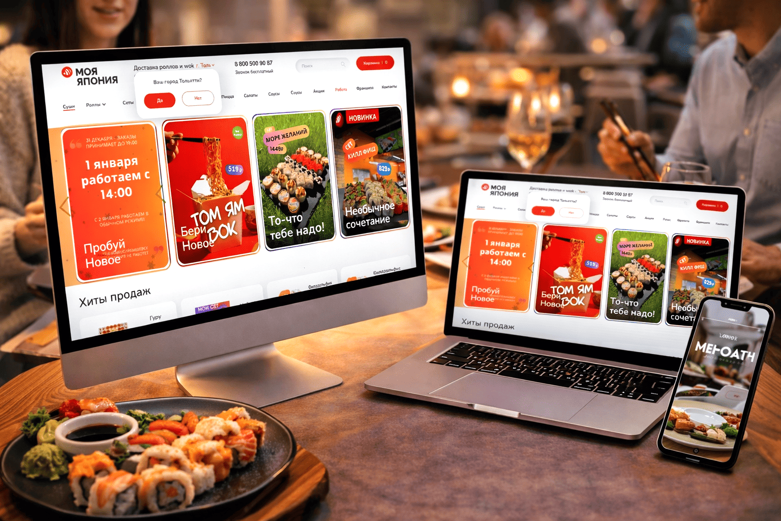 Лучшие сайты для кафе и ресторанов в сегменте суши и роллов живут по своим законам. Здесь нет места созерцательности и длинным паузам — сайт включается мгновенно, как яркий свет в витрине ночного города. Пользователь попадает не в «историю бренда», а в поток выбора, где каждое блюдо борется за внимание и почти всегда выигрывает.